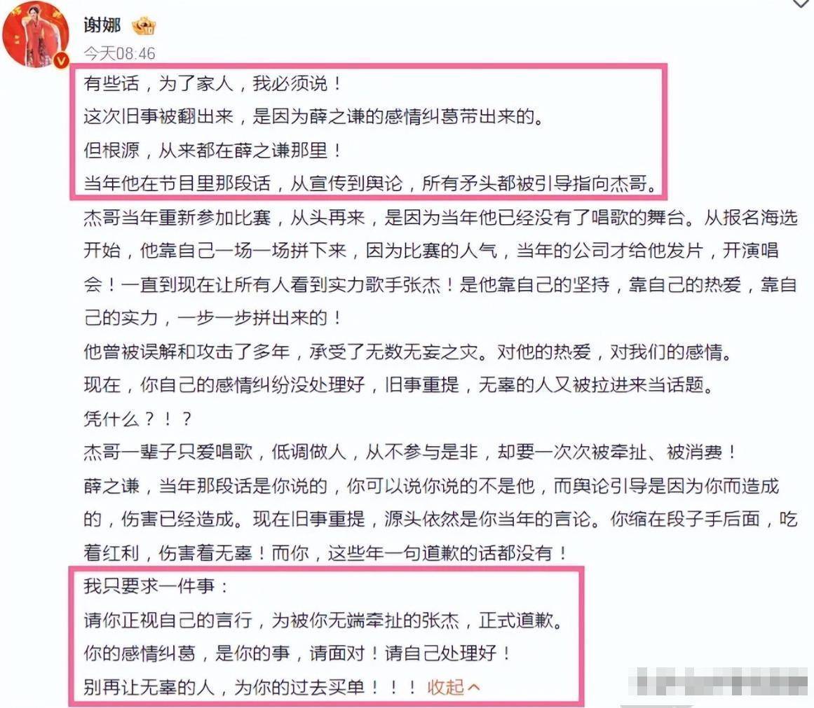 3月3日一早,护夫心切的谢娜打响舌战第一枪,在社交平台发长文,公开喊话薛之谦,要求他正视言行,为无端牵扯的张杰正式道歉。