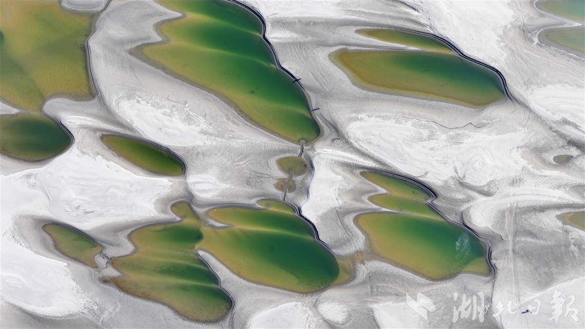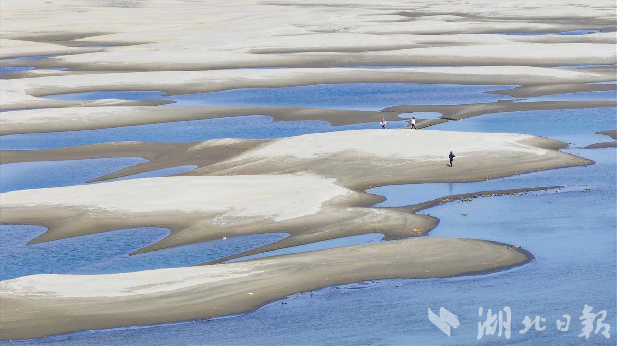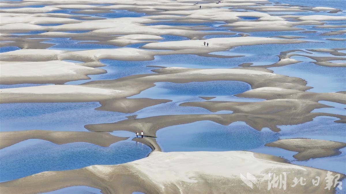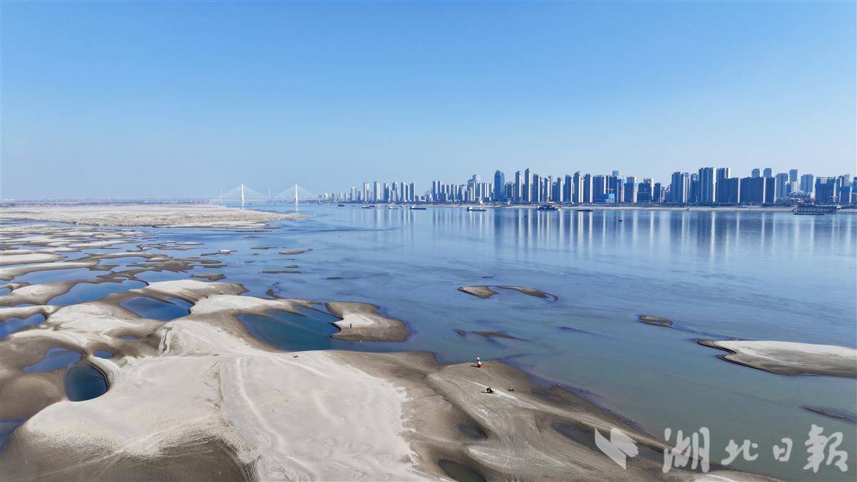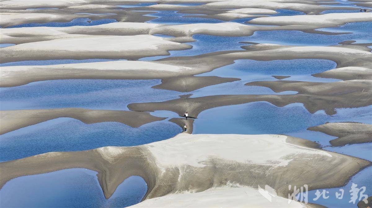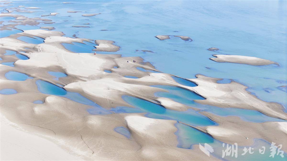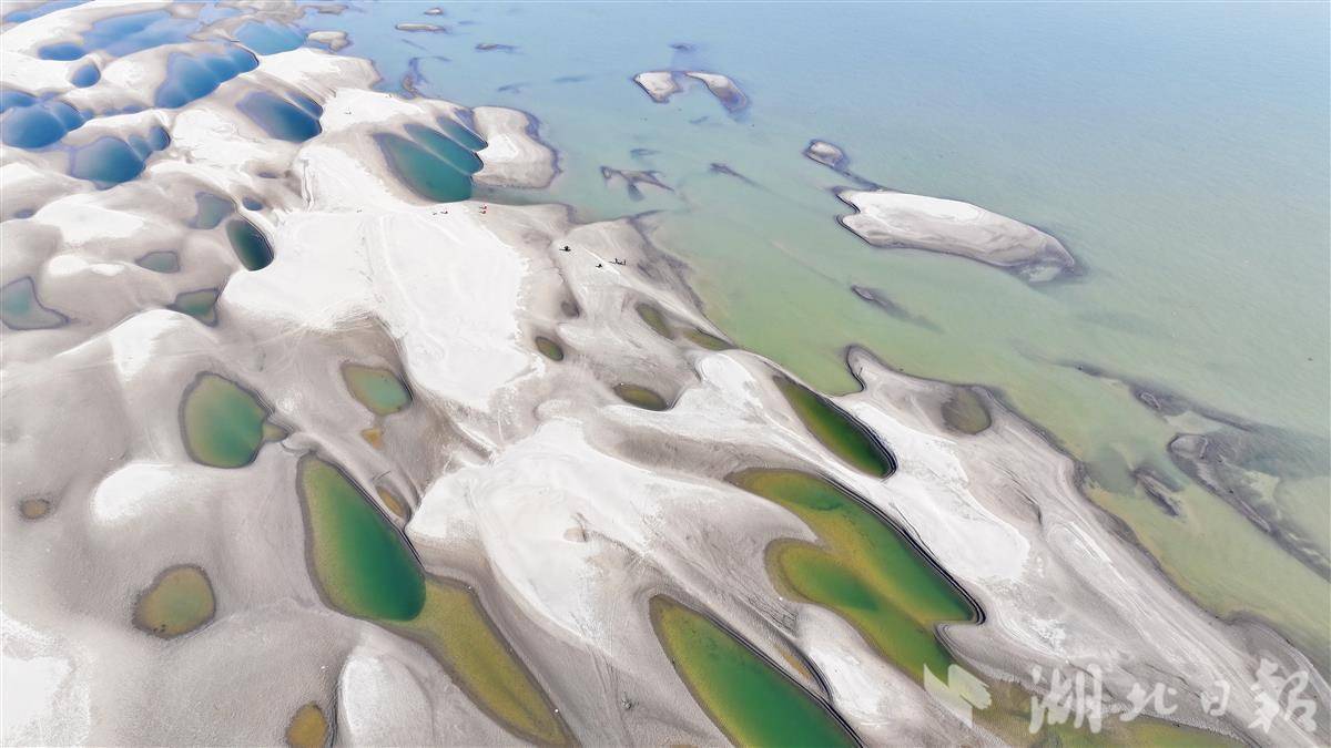 近日,受长江水位持续下降影响,汉口江滩至天兴洲间裸露的浅滩上,星罗棋布的沙坑群串联成链,形成一条绵延数公里的独特景观带。沙坑因蓄积江水,在阳光下折射出深浅不一的蓝绿色波纹,被市民称为“翡翠沙坑”。这些沙坑自 12 月现身,不断扩张蔓延,如今几乎将天兴洲与城市岸线连成一片,成为武汉冬季限定的自然景观。(湖北日报全媒记者 陈少哲 摄)