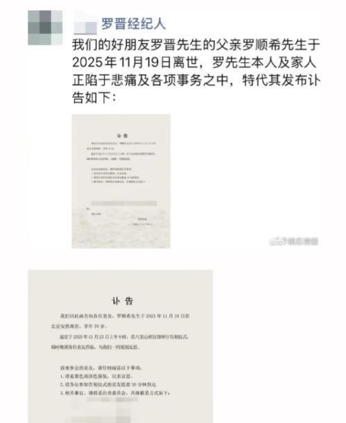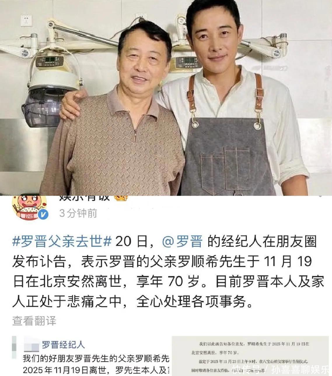 就在谣言最盛的时候,突然出现了转机。今年一月,罗晋的经纪人在朋友圈里发出了噩耗,说罗晋的父亲罗顺希先生在北京去世,享年70岁。罗晋和家人都沉浸在悲伤之中,专心致志地在打理父亲的后事。