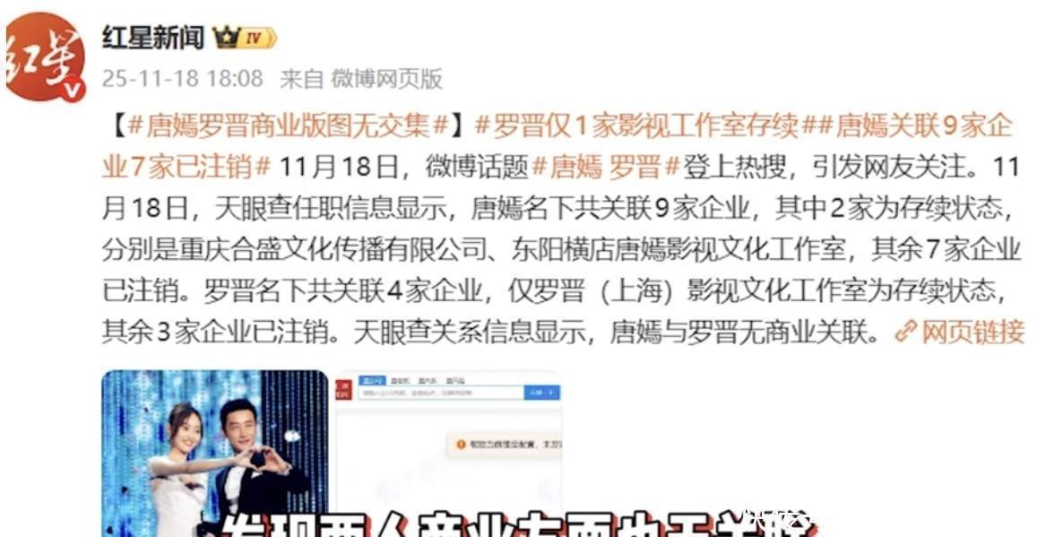 他们俩差不多快半年都没一起出现,也几乎没有互动在社交平台上。有些人觉得,这完全看不出是正常夫妻的模样。有人还注意到,唐嫣名下有9家企业,现在只剩下2家还在正常运营。罗晋手里头有4家企业,现如今只剩下一家处于存续状态。两个人之间没有任何共同挂钩的企业,这事儿真让人觉得不少疑点。